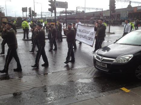 Und da ziehen sie vorbei, junge Mädchen tragen Gedenkbanner für gefallene IRA-Kämpfer, man sieht irische und schottische Fahnen sowie Transparente verschiedener irischer Gemeinden in Glasgow wie „Calton Irish“ oder die „Baillieston Republicans“ und dazwischen deren Marching Bands. Begleitet wird der Umzug auf der Straße durch Polizeieskorte, neben dem Zug läuft auf dem Gehweg eine Art „Ordnungsgruppe“, deren Aufgabe vermutlich darin besteht, etwaige Fragen von Passanten schnell und präzise zu beantworten. So richtig entspannt wirken die Jungs nicht, aber da ich vom Vortag noch einen Anstecker in den irischen Farben aus dem Saracen’s Head an der Jacke trage, bin ich safe und ein älterer Herr gibt mir im Vorbeigehen sogar die Hand.