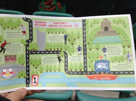 Dabei wurde ich Zeuge, wie ein Ordner versuchte, ein kleines Mädchen mit Hansa-Trikot und die zugehörige Familie vom Betreten der Haupttribüne abzuhalten, Stichwort: Fantrennung. Die Kleine (vielleicht 8 Jahre alt) wusste nicht, wie ihr geschah, die Eltern („Wir sind RB-Fans, nur sie ist für Hansa.“ – ein prächtiges Kind, nicht wahr?) drohten zu eskalieren, so dass ein Supervisor die Situation retten musste: „Mach einfach die Jacke zu, Kleine, dann geht das schon.“ Der Ordner fügte sich widerwillig: „Was soll das werden, wenn wir das mit allen machen?“