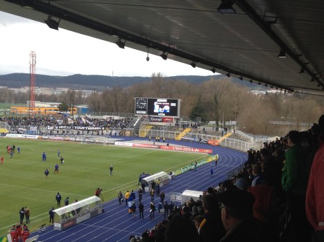 Nach langer Zeit zum ersten Mal wieder gesehen habe ich auch die Jenaer Südkurve, also die Heimhälfte. Optisch machte der Block wie immer einen guten Eindruck, wobei mir persönlich das permanente Fahnenwedeln mächtig auf die Nerven gehen würde, ist wohl Geschmackssache. Akustisch habe ich die Jungs aber schon sehr viel besser erlebt, wobei natürlich die aktuelle Ligazugehörigkeit nicht bei der Bewertung ausgeklammert werden darf. Ein kleiner aktiver Kern rund um die „Horda Azzuro“ ist beständig am Singen, wobei hier aber auch schon ein Teil des „Problems“ liegt. Es ist dieser nur selten ansteckende Dauer-Singsang, der in seiner Selbstverständlichkeit lähmend auf den Rest des Stadions wirkt. Nur selten reißt es die Tribünenbesucher mal von ihren Sitzen, lediglich in der Schlussphase merkt man dann auch bei uns auf der Haupttribüne mal, dass man bei einem Fußballspiel ist.