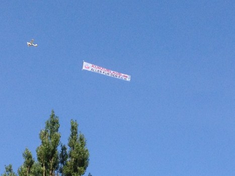 Unterdessen arbeitet Hansas neuer Hauptsponsor bereits an der Erringung der Lufthoheit über dem Stadion. Ein über der Stadt kreisendes Flugzeug mit hanseatischer Botschaft im Schlepptau sorgt in immer enger werdenden Schleifen dafür, dass die Störche zu Fuß gehen müssen. Rückblickend betrachtet wäre es sicher besser gewesen, diese Luftunterstützung noch während des Spiels aufrechtzuerhalten, dann wäre unserer Mannschaft ja vielleicht das Kopfballgegentor zum 1:0 erspart geblieben.