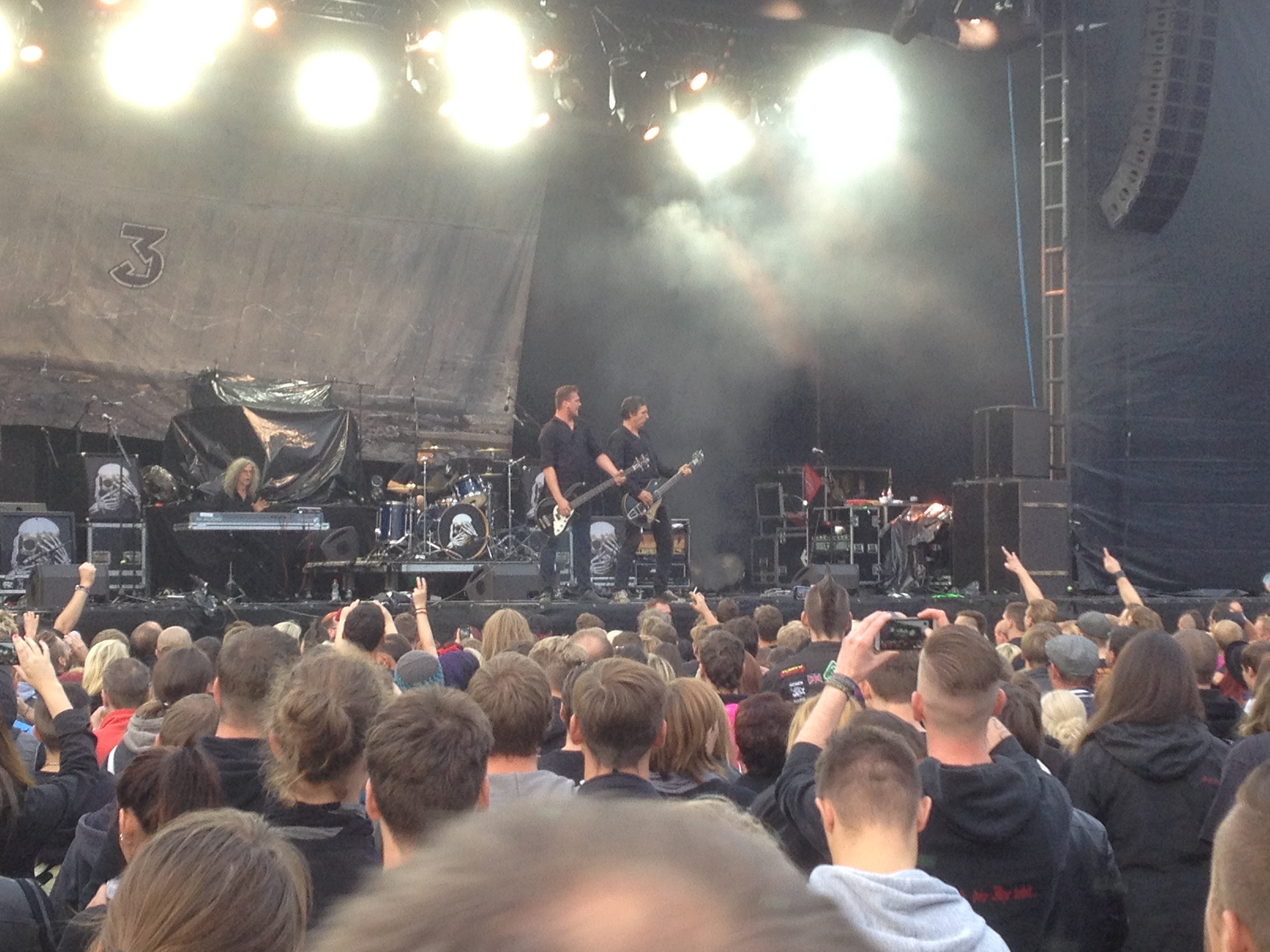 Pünktlich um 20:45 Uhr, die Bühne ist inzwischen von einem Vorhang verdeckt, das Licht geht aus und aus den Lautsprechern dröhnt Sham 69’s „If the kids are united“. Es folgt das „Preludio: Vanitas“ und mit dem fallenden Vorhang eröffnet ein furioses „Zurück zum Beton“ den Auftritt der Headliner des Abends. Das finale Open Air der „Live Noir“-Tour bestreiten die Düsseldorfer, als wäre es das letzte Konzert überhaupt – voller Energie und Spielfreude, von der Bühne strahlt eine unglaubliche Power aus, deren Echo aus dem Publikum zur Bühne zurückgesendet wird.