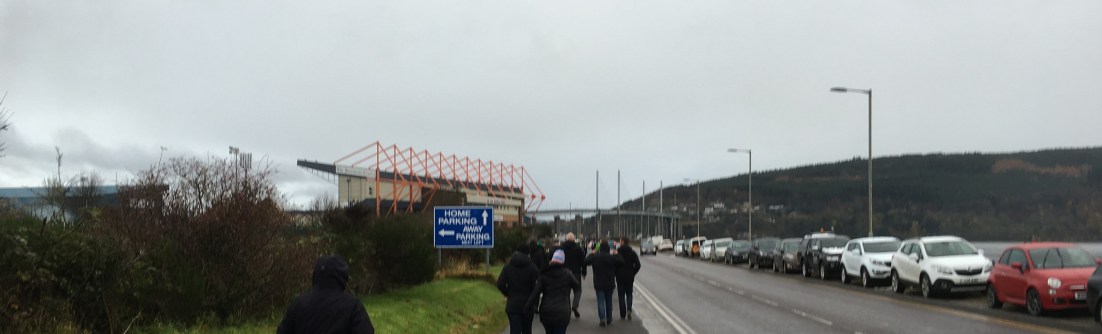 Den Weg vom Hotel zum Stadion legen wir zu Fuß zurück, das ganze zieht sich etwas hin, für ein bisschen V.I.P.-Feeling sorgen unterwegs Polizisten, die in Stadionnähe für uns den Verkehr anhalten, wenn wir die Straße überqueren wollen. Die letzten 500 bis 800 Meter legen wir auf einer Straße entlang der Küste (Moray Firth) zurück, als die Tribünen ins Blickfeld geraten, wird mir bewusst, dass wir uns auf dem Wege zu einer der am schönsten gelegenen Sportanlagen befinden, die ich je besuchen durfte.