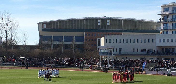Aufgrund des großen Andrangs beginnt das Spiel mit zwanzig Minuten Verspätung, vor dem Anstoß gibt es noch eine Gedenkminute für die Opfer der jüngsten Terroranschläge, die tatsächlich von allen Stadionbesuchern respektiert wird. Das ist ja – je nach Ausschankgeschwindigkeit – leider nicht immer so bei Veranstaltungen dieser Art. Respekt an alle Anwesenden!