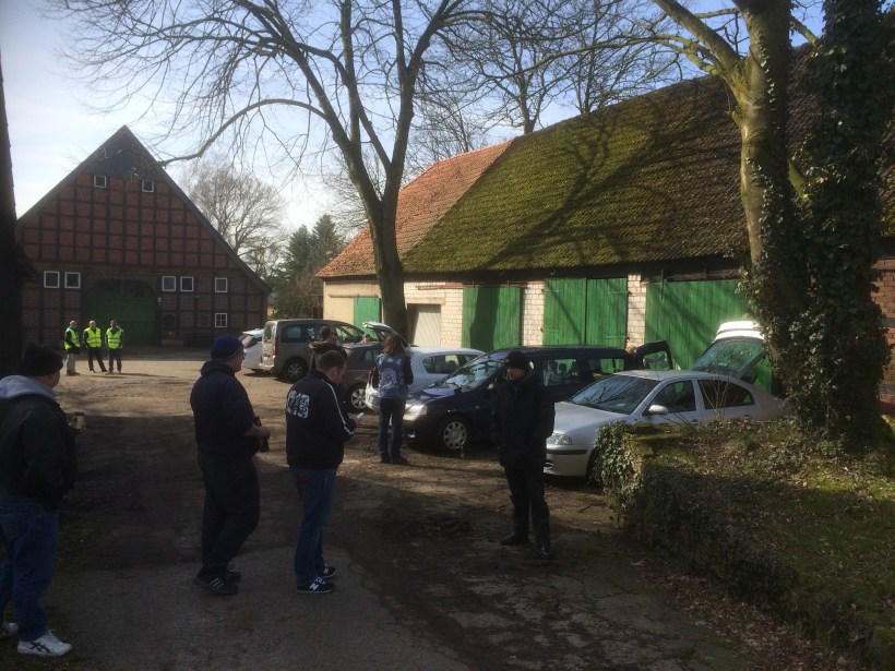 Nach knapp vier Stunden Fahrt, voll mit derart wirren Gedanken erreiche ich Lotte. Eine unbefestigte Straße führt vom Ortszentrum in Richtung des Stadions, nach Entrichtung der Gebühr in Höhe von 3 Euro weisen mir Ordner den weiteren Weg. In die Rolle des Gästeparkplatzes schlüpft bei jedem Heimspiel der Sportfreunde ein Bauernhof, bestehend aus einem Wohnhaus und mehreren Funktionsgebäuden und den angrenzenden Wiesen. Rechtzeitiges Erscheinen sichert eine befestigte Stellfläche, da hat sich das frühe Aufstehen schon mal gelohnt und ich bin überaus erleichtert, dass mein neuer Flitzer auf seiner Jungfernfahrt nicht im Schlamm eines mutmaßlich von den Niederschlägen der letzten Wochen durchweichten Ackers auf mich warten muss.