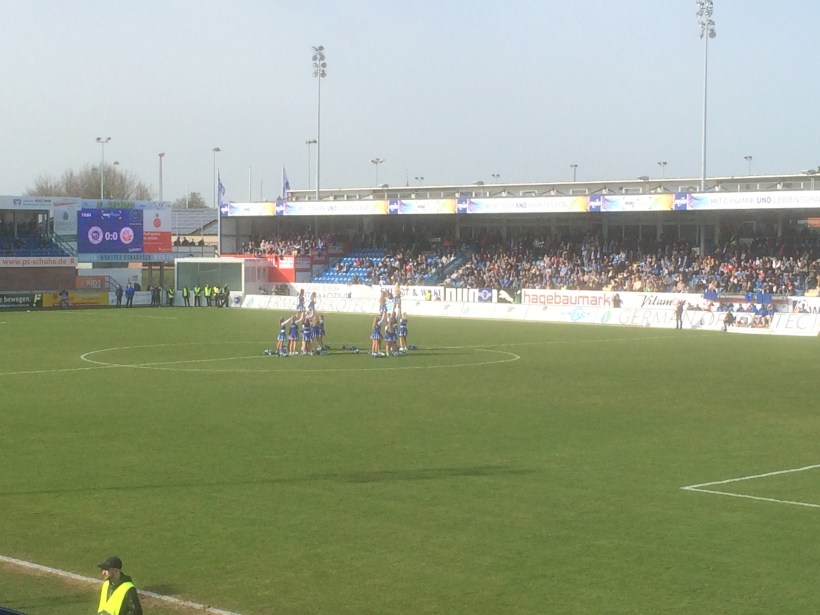 Die ebenso befremdlichen wie offenbar unvermeidlichen Cheerleader-Mädchen „Blue Sparks“ und später im Spielverlauf immer wieder eingestreute Werbung (alles wird von Sponsoren präsentiert: der Spielball, Eckbälle, gelbe und rote Karten und sogar der Beginn der letzten fünf Minuten in jeder Halbzeit) zeigen eines: Hier wurde verstanden, was alles benötigt wird, um den Leuten großen Fußball zu bieten, so wie er im Fernsehen inszeniert wird. Über kurz oder lang wird das „Volle Lotte!“-Geschrei noch so manchem DFL-Verein die Ohren klingen lassen.
