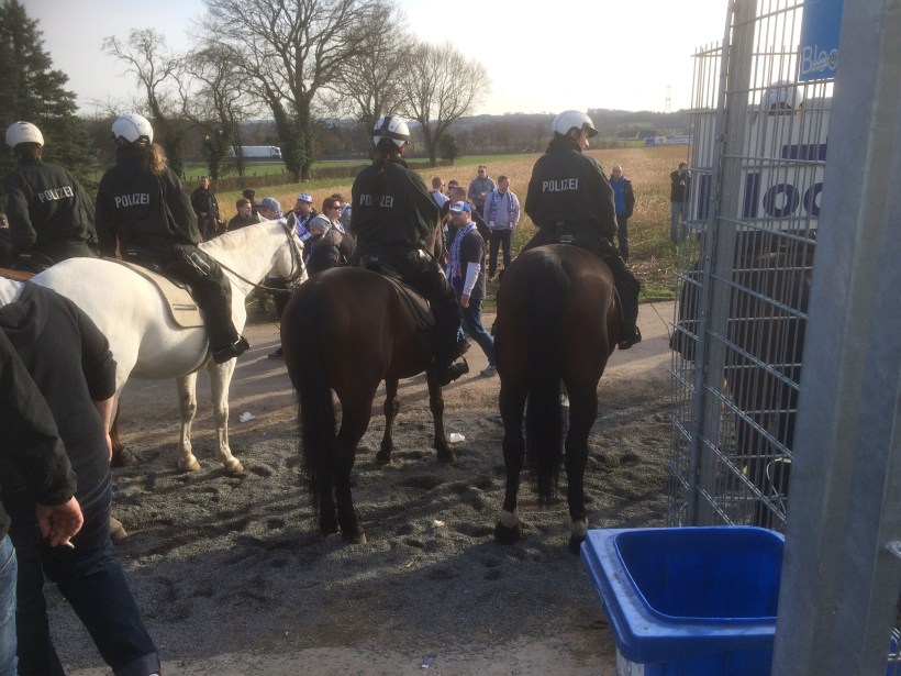 Beim Verlassen des Gästeblockes wird der Ausgang durch den oben erwähnten Reitertrupp verstellt, die riesigen Hinterteile der Tiere haben eine beunruhigende Ausstrahlung, aber noch beängstigender ist, dass der Raum zum Vorbeigehen für die Fans äußerst begrenzt ist – praktisch in Trittweite. Ich weiß nicht, ob das bei so nervösen Geschöpfen zweckmäßig ist, von den Pferden ganz zu schweigen. Nichts wie weg hier.