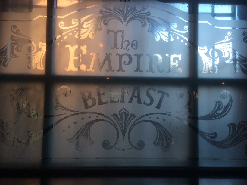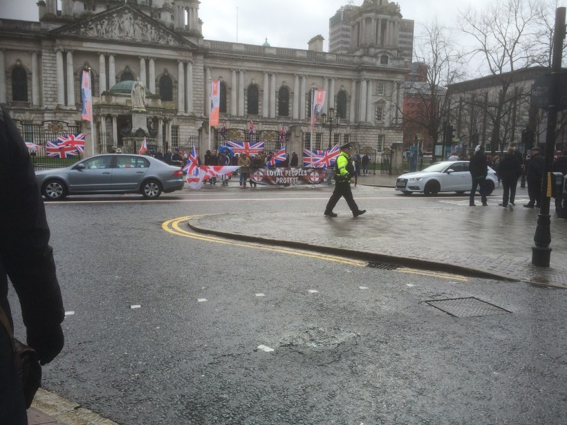 Zwei Ecken weiter bekommen wir dann unsere oben erwähnte Chance, die Parade unbedrängt und aus nächster Nähe noch einmal zu verfolgen. Mit ausreichend Bildmaterial in annehmbarer Qualität ausgestattet gehen auch wir nun zum gemütlichen Teil über. Nach der ersten Notbetankung im „Dirty Onion“ führt unser Weg zum traditionsreichen „Crown Liquor Saloon“. Wir kommen noch einmal am Rathaus vorbei, vor dessen Zufahrt jetzt etwa zwanzig kronentreue Loyalisten eine Art Gegenveranstaltung zum St. Patrick‘s Day abhalten. Außer ein paar etwa zehnjährigen Jungs mit grünen Schals, die von der anderen Straßenseite aus und hinter dem schutzbietenden Rücken eines Polizisten Grimassen schneiden und ihre Mittelfinger in die Luft strecken, nimmt kaum jemand Notiz von der Aktion. Wenn es eines Beweises bedürfte, wie stabil die Aussöhnung in Nordirland inzwischen im öffentlichen Bewusstsein verankert zu sein scheint, dann ist es diese Szene.