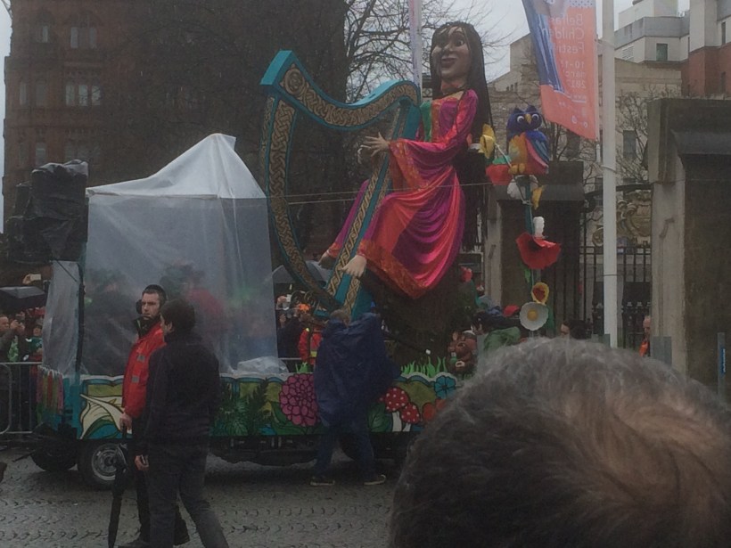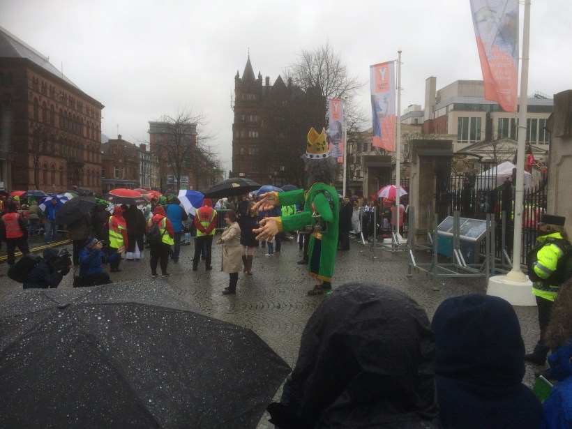 Mit etwas Verzögerung erscheint ein überdimensionaler St. Patrick und begrüßt die Umstehenden. Nachdem auch die Stellvertreterin des Bürgermeisters eingetroffen ist und Paddys Segen entgegengenommen hat, setzt sich der Zug in Bewegung. Der Regen ist jetzt stark genug. Unsere Sicht in der fünften/sechsten Reihe ist etwas eingeschränkt, aber wir können uns ja zu Hause unsere Über-Kopf-Fotos anschauen. Was wir jetzt noch nicht wissen, wir werden nur wenig später noch die Möglichkeit haben, die komplette Parade aus nächster Nähe und ohne Menschengedränge zu sehen.