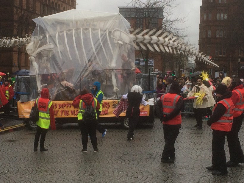 Ein weiterer Wagen zeigt ein Motiv aus der Kreidezeit: unter einem Dinosaurier-Skelett spielt eine Band nach Art der „The BC 52‘s“ Popsongs, eine Akrobatikgruppe tanzt dazu im Cheerleader-Style. Als der Wagen bei der Ausfahrt an einer Bordsteinkante abrupt stoppt, stürzt der Gitarrist der Band, spielt aber – ganz Profi – im Liegen weiter. Seine Aufstehversuche werden zusätzlich erschwert durch das Bemühen der Lenker, den Wagen mit schnellem Anschwung wieder in Gang zu bringen. Hätte man mal filmen sollen.