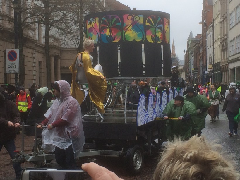 Mein Lieblingswagen ist gleich der erste: Eine überlebensgroße keltische Schönheit spielt auf ihrer Harfe, unter einer Zeltplane vor ihr spielen Musiker mit traditionellen Instrumenten zum Tanz für zwei Gruppen junger Mädchen, die vor dem Wagen laufend ihr Können zeigen. Das ist, neben einer Bags & Pipes Marching Band, auch schon der am meisten folkloristische Abschnitt der Parade.