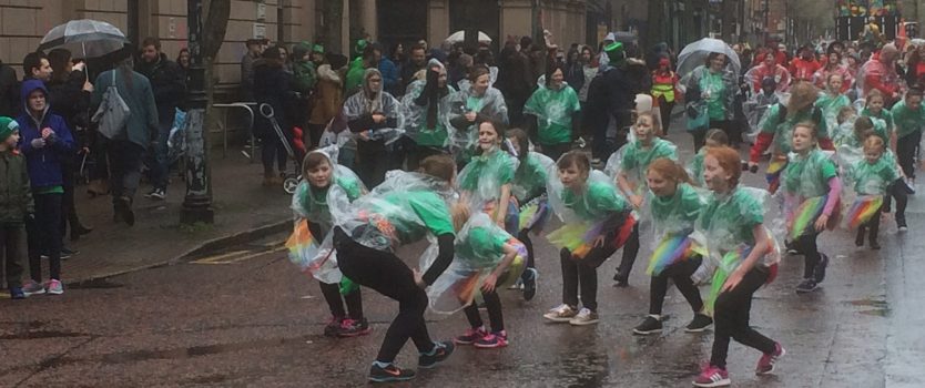 Mit etwas Verzögerung erscheint ein überdimensionaler St. Patrick und begrüßt die Umstehenden. Nachdem auch die Stellvertreterin des Bürgermeisters eingetroffen ist und Paddys Segen entgegengenommen hat, setzt sich der Zug in Bewegung. Der Regen ist jetzt stark genug. Unsere Sicht in der fünften/sechsten Reihe ist etwas eingeschränkt, aber wir können uns ja zu Hause unsere Über-Kopf-Fotos anschauen. Was wir jetzt noch nicht wissen, wir werden nur wenig später noch die Möglichkeit haben, die komplette Parade aus nächster Nähe und ohne Menschengedränge zu sehen.
