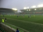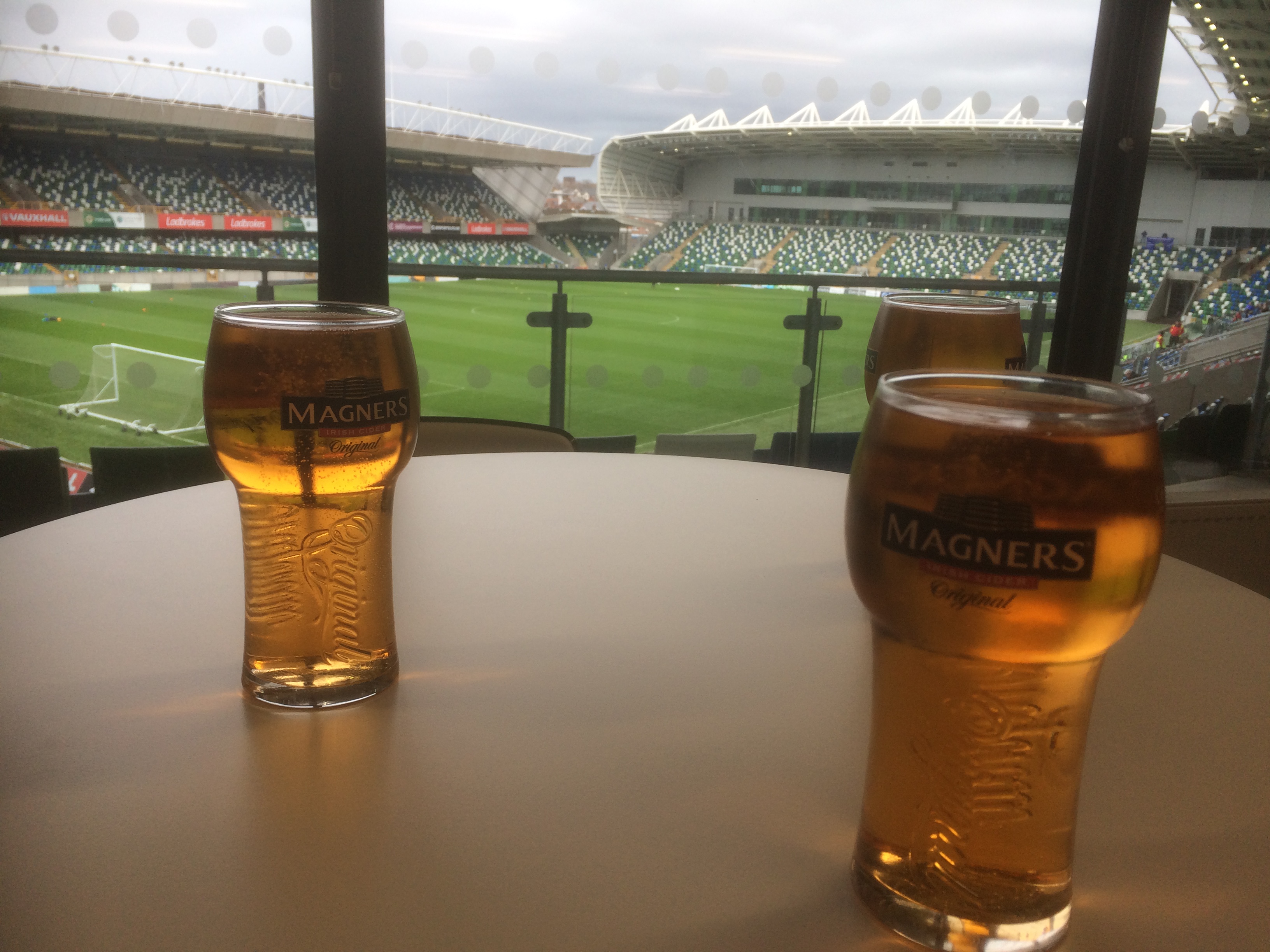Egal, wir sind endlich da, kaufen uns jeder eine Karte für 10 Pfund und gehen hinein. Erst mal ein kurzer Blick in den Innenraum, dann fragen wir einen Steward nach der ominösen Bar. Zu unserer Überraschung lacht dieser uns nicht etwa aus, sondern zeigt kurz auf eine Tür, vor der ein weiterer Ordner steht: „Dort rein und einfach die Treppe hoch.“ Und tatsächlich sitzen wir drei Minuten später auf drei Barstühlen um einen runden Tisch in der „Tennants Lounge“ und gönnen uns jeder ein Pint Magners. Durch eine große Glasscheibe können wir das Stadioninnere und das komplette Spielfeld sehen. Eigentlich sollten wir das Spiel gleich von da schauen, aber das widerspricht meiner Vorstellung von einem Stadionbesuch völlig. Außerdem stimmt mit 5 Pfund für ein Pint das Preis-Leistungs-Verhältnis auch nicht ganz.
