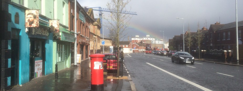 Im Anschluss gehe ich ein Stück zurück, die Falls Road entlang. Der „Falls Memorial Garden“ hält die Erinnerung an republikanische Opfer gewaltsamer Auseinandersetzungen während der Unruhen, auf Gedenktafeln sind zahlreiche Namen veröffentlicht – von Kämpfern wie von zivilen Opfern. Der bekannteste unter ihnen ist Bobby Sands, Dichter, Sprachpfleger, Revolutionär und IRA Volunteer, der 1981 im Alter von 27 Jahren an den Folgen eines Hungerstreiks verstorben ist. Ein paar Querstraßen weiter befindet sich das dem Volkshelden gewidmete Wandbild mit dem berühmten Ausspruch: „… Unsere Rache wird das Lachen unserer Kinder sein.“ Ich weiß nicht, ob er mit der heutigen politischen Situation in seiner Heimat zufrieden wäre, das friedliche Leben in Belfast 2017 und der Anblick fröhlich tanzender Kinder bei der St. Patrick‘s Day Parade hätten ihm aber sicher gefallen. Wie zur Bestätigung erscheint, als ich mich abwende, um zum Haltepunkt zurückzugehen, ein Regenbogen über Falls Road.