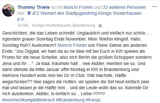 Ein Monat ist vergangen seit dem Konzert im „Stadti“ Königs Wusterhausen und noch einmal macht der großartige Abend positive Schlagzeilen. Nachdem Feine Sahne Fischfilet auf ihre Gage für den Auftritt verzichtet hatte, haben Band und Stadtjugendring den erzielten Überschuss zu zu gleichen Teilen an das Flüchtlingsprojekt „Sprechcafe“ und den SV Babelsberg 03 gespendet. Die Spende an den SVB 03 zur Unterstützung in der aktuellen Auseinandersetzung mit dem NOFV hat Thommy heute in Potsdam überreicht.