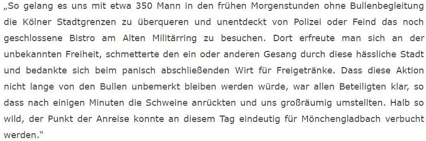Gegenstand des heutigen lyrischen Ergusses ist der Auszug aus einem Bericht vom rheinischen Bundesliga-Derby zwischen dem 1. FC Köln und Borussia Mönchengladbach (2:1 am 14. Januar), den ich in einem sozialen Netzwerk entdeckt habe und in dem die Anreise einer Gruppe Gästefans beschrieben wird: