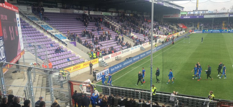 Und doch geschieht vorerst nichts. Ich suche mir einen Platz links oben im Gästeblock, mit guter Sicht zum Spielfeld und auf die benachbarte Haupttribüne. Weitere Fans, die nach und nach die Plätze um mich herum einnehmen, berichten von einem sehr entspannten Einlass. Unten am Zaun werden inzwischen die Fahnen aufgehängt, das deutet darauf hin, dass offenbar auch die mitgebrachten Fanutensilien ohne Probleme ins Stadion mitgenommen werden durften. Na also, wer sagt‘s denn? Jetzt muss „nur noch“ die Mannschaft mitspielen – in jeder Hinsicht.