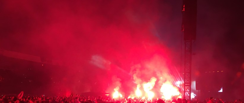 Zwischen dem unbändigen Drang, völlig unkontrolliert wie ein Gummiball im Rhythmus der Beats auf dem Boden herumzuspringen („Endboss“, „Adrenalin“), und weit aufgerissenen Augen, die ungläubig das Lichtermeer auf den Tribünen und im Innenraum anstarren („Welt der Wunder“), geht es praktisch im Minutentakt auf und ab. Und muss ich etwas über den herzerwärmenden Anblick der zahlreichen Leuchtfeuer sagen, die „Bengalische Tiger“ illustrieren? Oder die nochmals explodierende Stimmung beim gemeinsamen Auftritt mit Casper? Miss Platnum bei „Lila Wolken“?