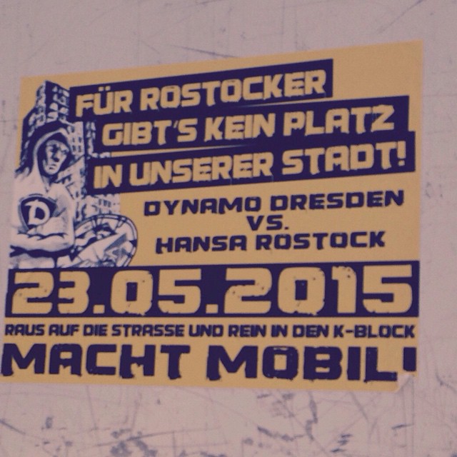 Der Tag beginnt in aller Frühe am Werbellinsee, wo ich die Pfingstfeiertage verbringe. Sieben Uhr morgens breche ich dort auf und treffe knapp dreißig Minuten später meine Mitfahrgelegenheit am Autohof Hohenschönhausen. Von dort aus begeben wir uns zu unserem ersten Zwischenziel in der Dresdener Neustadt, wo wir unsere Eintrittskarten in Empfang nehmen. Wir werden das Spiel aus dem Heimbereich verfolgen, das wurde schon während des Theaters um das Gästekontingent klargemacht. Die Übergabe beim konspirativen Treff im Feindesland klappt hervorragend und wir bringen dann das Auto in eine friedliche Gegend in der Nähe des Blauen Wunders.