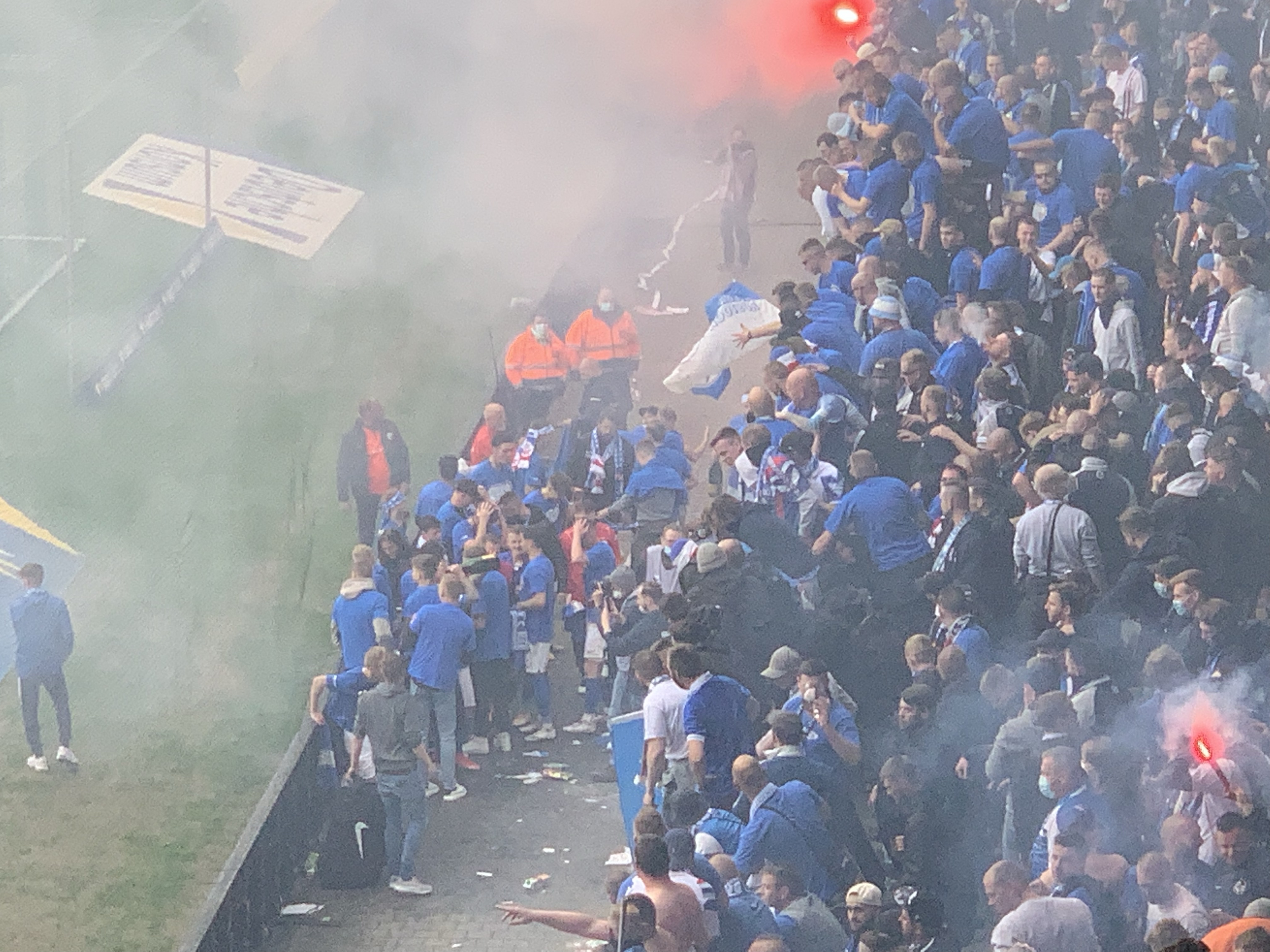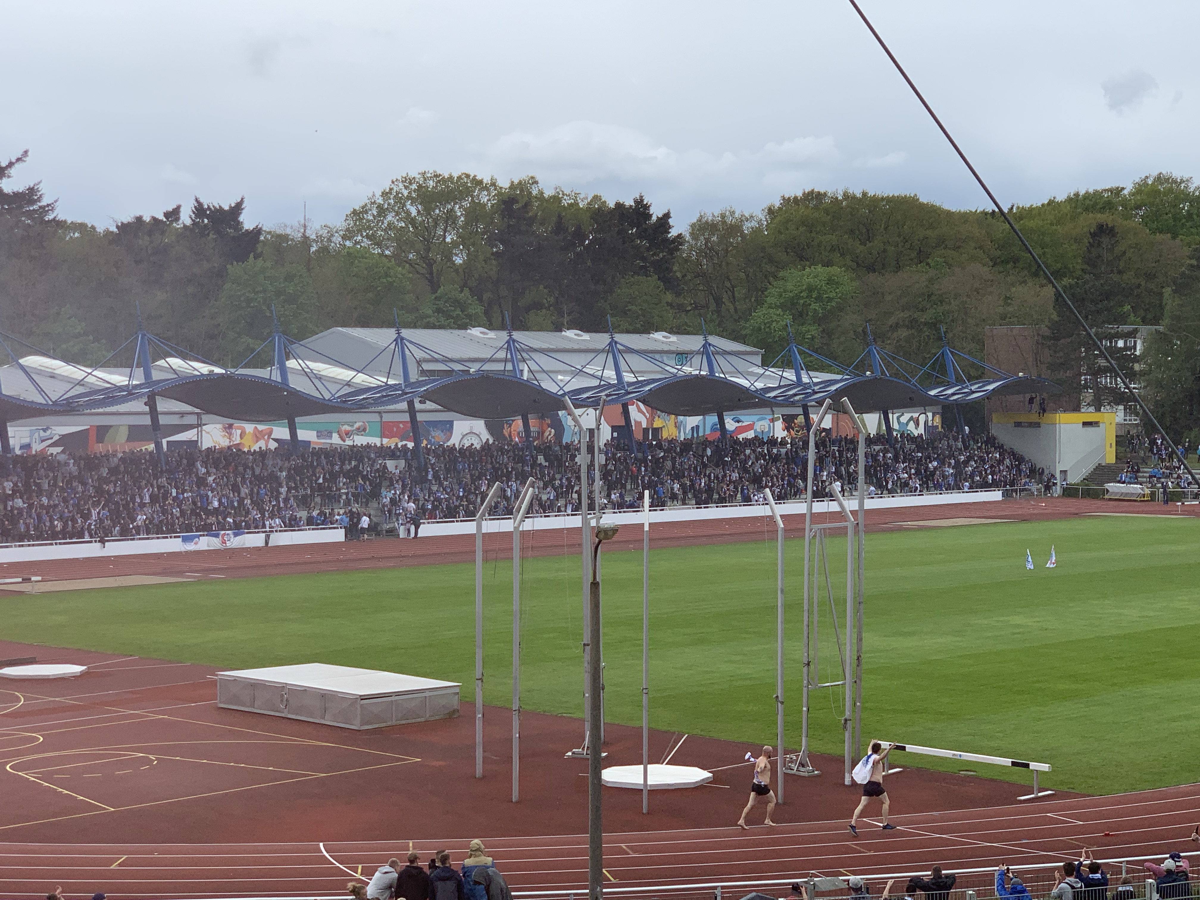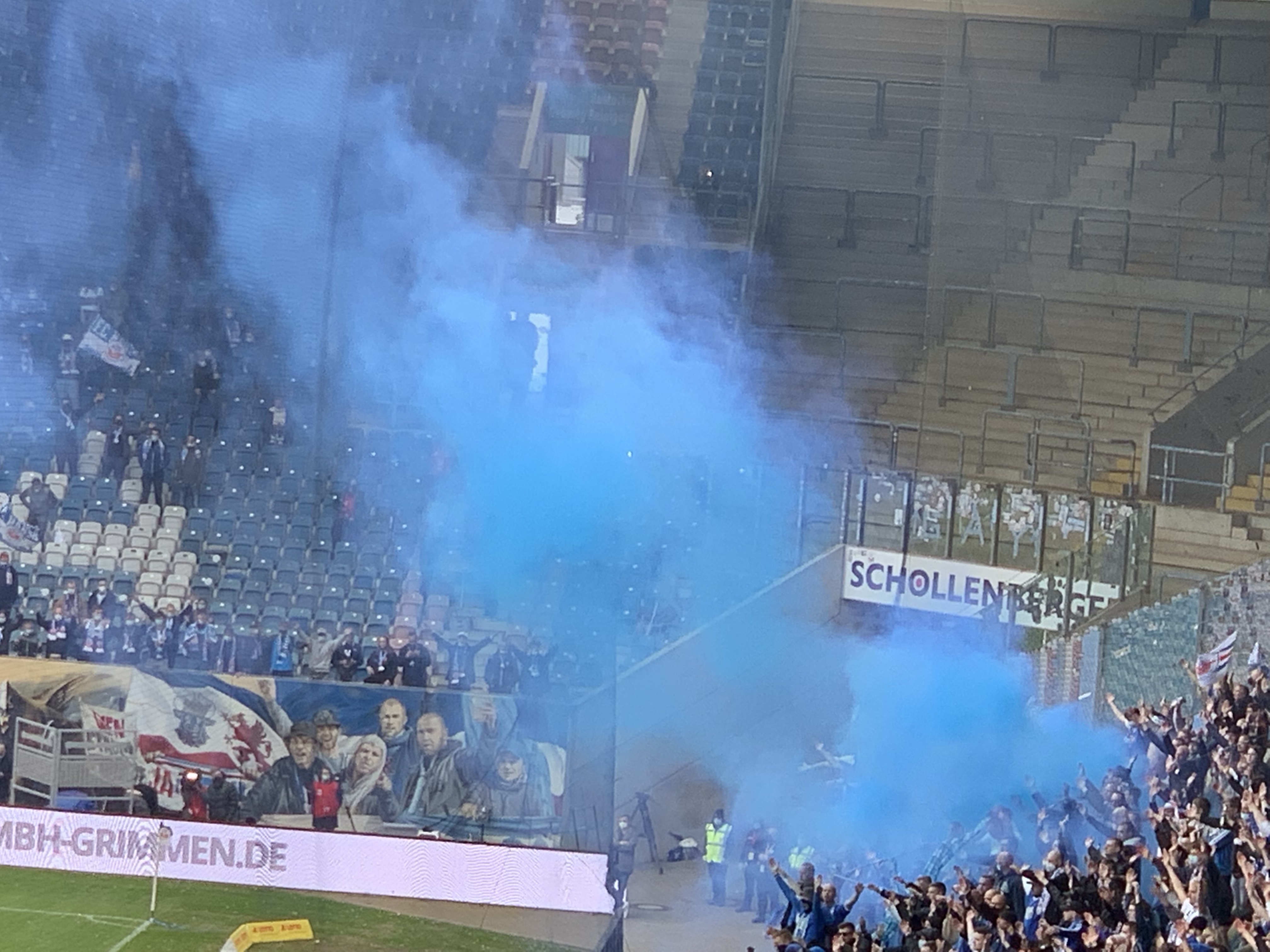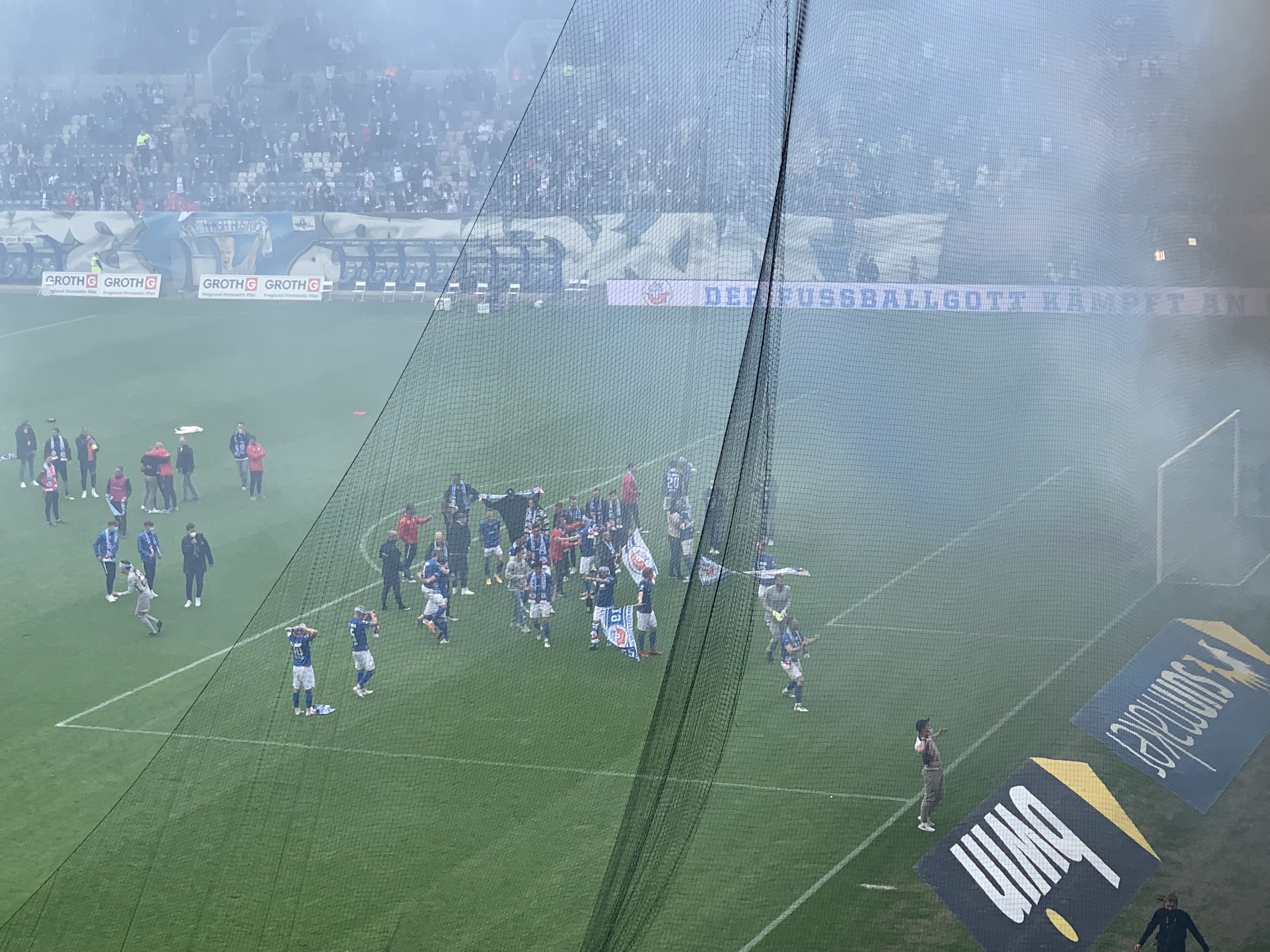 Und was habe ich die kollektive Lästerei in unserem Block über das Spielgeschehen vermisst. Höhepunkt ein Kommentar in der kurzen Stimmungsflaute zwischen 0:1 und 1:1: Zuschauer im Stadion gefährden den Aufstieg. Auf dass uns diese hanseatische Gelassenheit erhalten bleibe.