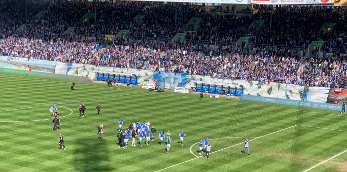 Offiziell 24.500 Zuschauer sind bei der saisonentscheidenden Partie gegen den SC Paderborn im Ostseestadion dabei. Das ist eine stattliche Kulisse, deren Explosion bei einem Siegtreffer durch JV18 dem ganzen sicher die Krone aufgesetzt hätte, aber schon die Stones wussten: „You can’t always get what you want.“ Immerhin sehen wir ein rasantes, kampfbetontes Spiel. Paderborn gehört nun mal nicht zur sportlichen „Laufkundschaft“ der Liga und macht auch nicht den Eindruck, einfach nur die Zeit verstreichen lassen zu wollen. Die haben ein spielstarkes Team, das bis zur letzten Minute dafür sorgt, dass ich immer wieder abwechselnd zur Uhr und zum Zwischenstand in Dresden schaue, um mich gleich wieder dem Support anzuschließen, wie es der größte Teil des Publikums tut, weshalb Struppi nicht müde wird, zu fordern: „Wir brauchen das ganze Stadion!“