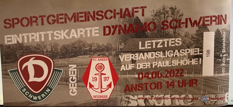 Heute ist nun der Tag gekommen, an dem hier das letzte Pflichtspiel ausgetragen wird. Es ist Zeit für den Abschied. Dynamo empfängt am letzten Spieltag der Verbandsliga den FC Anker Wismar. Ein Punkt würde reichen, um den zeitgleich siegenden 1. FC Neubrandenburg im Fernduell um den Ligatitel auf Platz 2 zu verweisen. Ich mache es gleich kurz, vom Spiel selbst habe ich nicht viel mitbekommen. Dynamo gewinnt mit 1:0 und darf sich auf Spiele in der NOFV-Oberliga freuen, ein toller sportlicher Erfolg, der diesem traditionsreichen Stadion gut zu Gesicht stehen könnte, woraus nun bekanntlich nichts wird. Es ist, wie es ist, auf Spiele gegen die Hansa-Amateure, den MSV Pampow und das Schweriner Derby gegen den FC Mecklenburg auf dem „schicken“ neuen Nebenplatz im Sportpark Lankow darf man aus den vielfältigsten Gründen gespannt sein. 😊