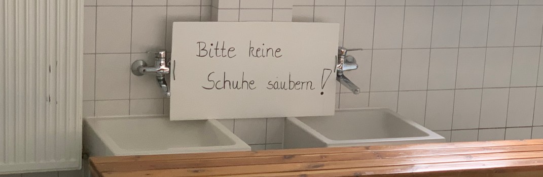Wir kommen in Vietlübbe an. Die Anfahrt führt durch eine kleine Siedlung mit schmucken Gehöften beiderseits der schmalen Straße, an deren Ende plötzlich der Sportplatz auftaucht. Neben der Zufahrt zur Parkplatzwiese wird Baumaterial gelagert. Von einem Stapel Pflastersteine grüßt leuchtend blau ein kunstvoll gesprühtes FCH-Tag. Home sweet home.