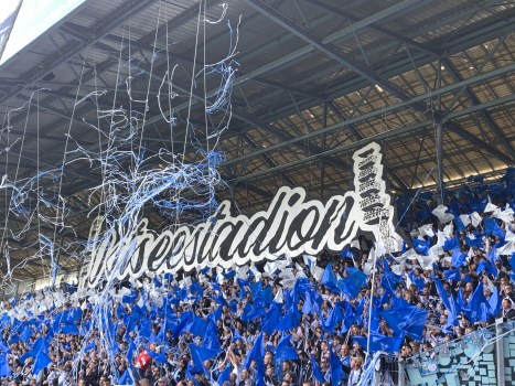 Für den Heimbereich des Ostseestadions wurde „Ausverkauft!“ vermeldet, im Gästeblock war das erkennbar nicht der Fall. Die Gründe dafür kenne ich nicht, spekulieren will ich nicht, aber es wird schon welche geben. Bedauerlich ist das in erster Linie für das Gästeteam, das in der aktuellen sportlichen Situation sicher jede Unterstützung der eigenen Fans gut gebrauchen kann, wozu die „Löwen“ ja durchaus in der Lage sind, wie wir uns zuletzt beim Saisonfinale im Mai überzeugen konnten. Schade.