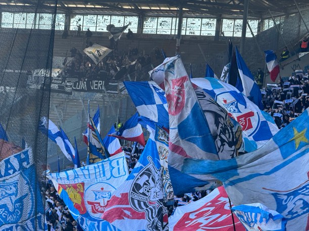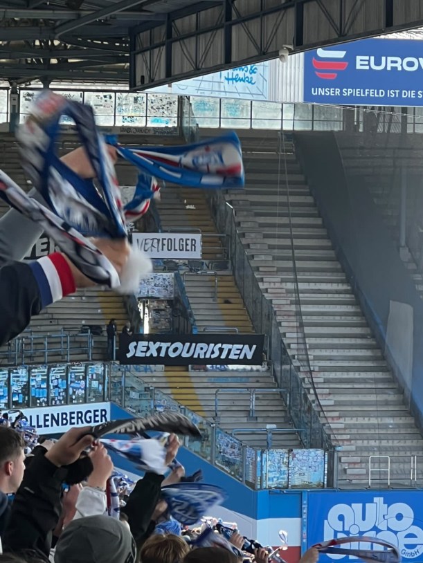 Das Spiel lockt mehr als 24.000 Besucherinnen und Besucher ins Ostseestadion, darunter ein Junggesellenabschied, der zum Glück nur vor dem Stadion auffällt, die einen vergnüglichen Nachmittag genießen dürfen, vielleicht mit Ausnahme gewisser „Touristen“ im Gästeblock.