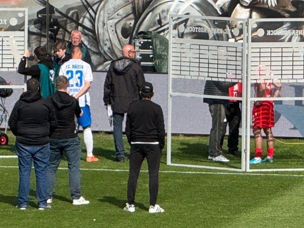 Als Heimpublikum müssen wir uns heute auch nicht „schämen“. Nach dem schnellen Rückstand gibt es keine lange „Schockphase“, die lautstarke Unterstützung der Mannschaft von allen Tribünen bei ihrer leider vergeblichen Aufholjagd bis zum Schlusspfiff bleibt, mit winzigen Ausnahmen, vorbildlich. So sieht „Niemals aufgeben!“ aus.