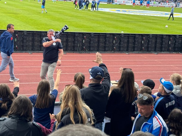 Für den Einlass ins Stadion stehen genügend Eingänge und Sicherheitspersonal zur Verfügung, das klappt echt hervorragend. Einziger möglicher Kritikpunkt vielleicht: Ich sehe keine (?) Zugangskontrolle zu den Sitzplätzen, die werden irgendwie sich selbst überlassen, und da haben wir schon das „Pokalwunder“, ein offenbar sehr diszipliniertes Publikum belegt die zur Verfügung stehenden Plätze anscheinend konfliktfrei, wobei kein Sitz unbesetzt bleibt, ein Lehrbuchbeispiel gelungener Selbstregulierung, die ja immer so gern angemahnt wird.