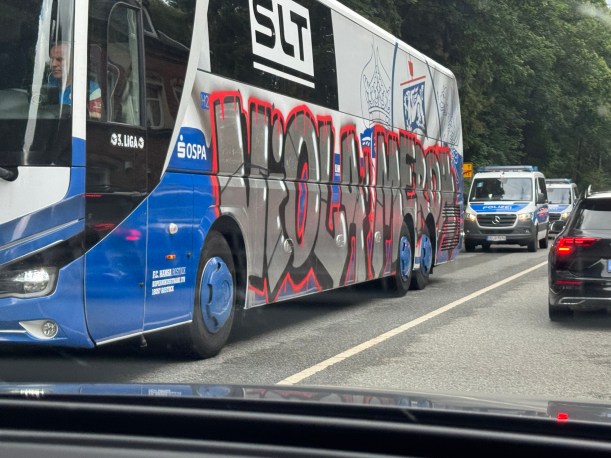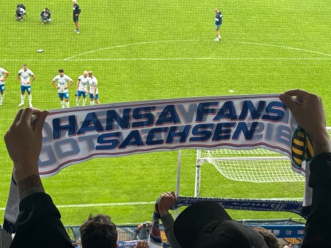 Rund um das Spiel ergibt sich eine bizarre „Drittort-Auseinandersetzung“, in deren Mittelpunkt der hanseatische Mannschaftsbus steht. Westsachsen macht Faxen. Wie gut, wenn ein Verein in seinen Fanreihen das künstlerische Potenzial versammelt, derartige „Attacken“ noch am gleichen Tag und vor Ort zu beantworten.