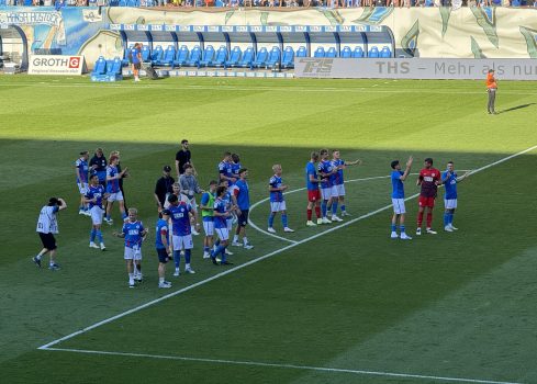 Der fast (?) ausverkaufte Heimbereich präsentiert sich in guter Verfassung. Dass die Leute Bock haben, habe ich schon erwähnt. Sogar in meinem Block auf der Westtribüne haben wir heute keine „Nachzügler“, alle sind pünktlich zum „Hansa forever“ an ihren Plätzen und mit voller Stimme dabei. An der Stelle mal eine kleine Anmerkung, die mir seit Jahren unter den Nägeln brennt: Im Refrain muss es am Ende richtig heißen