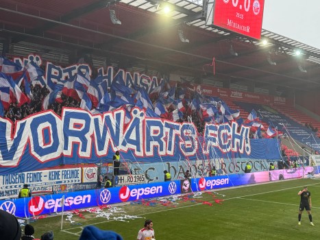 Wie ein solcher treten die Hanseaten auf dem Platz auch heute phasenweise auf. Ruhig, abgeklärt und geduldig läuft der Ball durch unsere Reihen, es scheint nur eine Frage der Zeit, dass sich das im Ergebnis ausdrückt. Und tatsächlich dürfen wir in der 32. Minute die verdiente Hansa-Führung bejubeln, die wir, angereichert mit einem verschossenen Elfmeter (der nach der TV-Zusammenfassung ohnehin etwas zweifelhaft erscheint, wir gewinnen auch ohne Geschenke!) und einer Roten Karte gegen Regensburg, entspannt mit in die Pause nehmen.